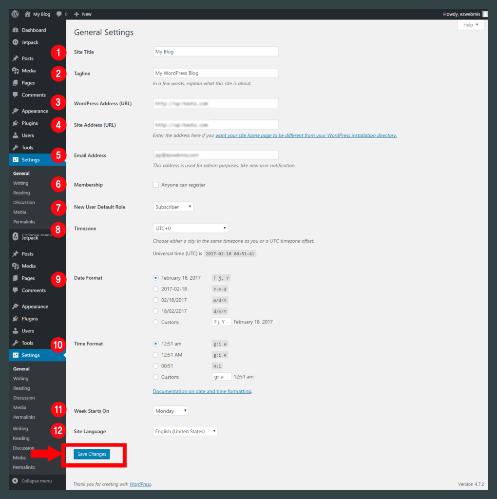 E. Email (필수) : 웹사이트에서 이메일을 받거나 보낼 때 기본이 되는 이메일을 입력하세요. 일반적으로 워드프레스를 설치할때 사용하셨던 이메일이 나타나는데 그대로 사용하시면 됩니다.