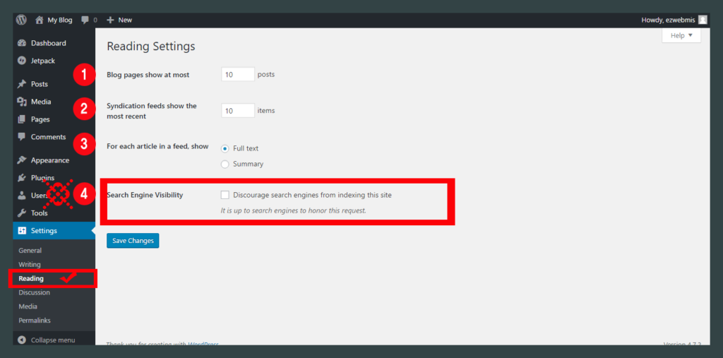- Reading(읽기설정): 웹사이트의 홈페이지 설정, 검색엔진 노출여부등의 설정을 지원합니다.