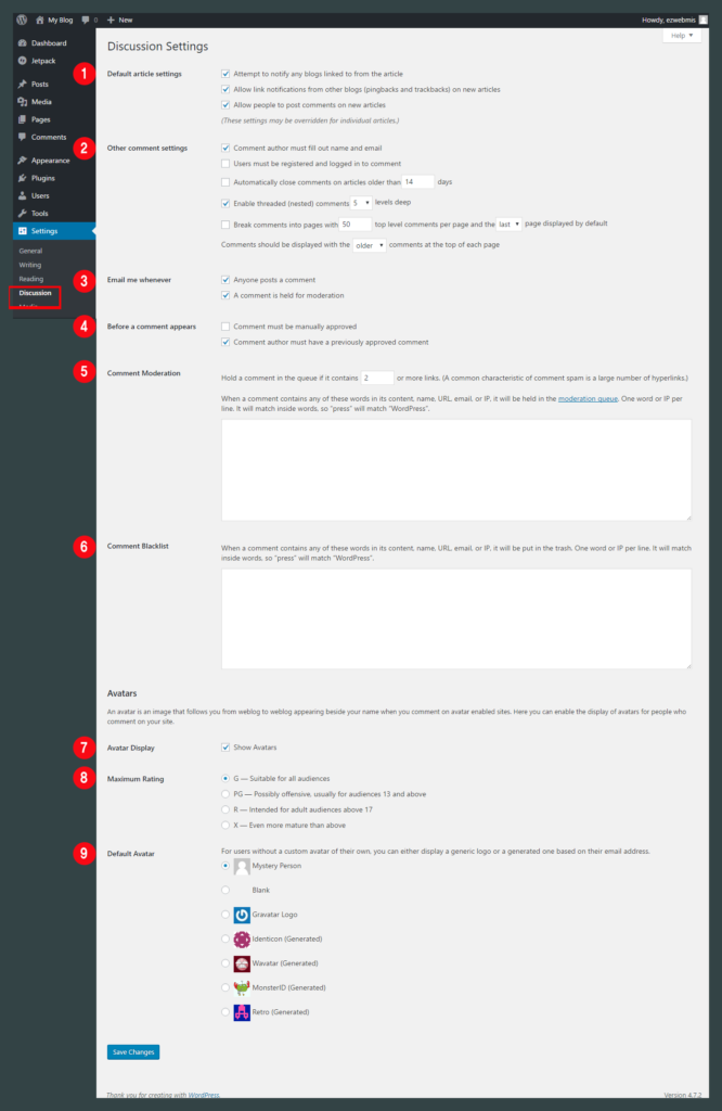 *관리자 사이트로 로그인 후 Settings > Discussion을 클릭하세요.