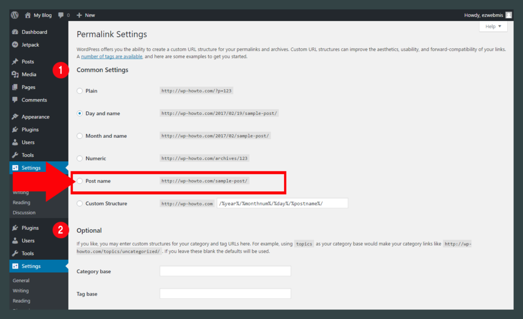 A. Common Setting : Permalink 설정은 여러분의 페이지나 포스트의 URL 구조를 결정해 줍니다. 일반적으로 ‘Post name’으로 설정을 해주면 가장 문제가 없습니다. 왜냐하면 대부분의 디자인테마와 플러그인들이 이설정을 기본으로 하는 경우가 많기 때문입니다. 그리고, SEO(Search engine optimization) 관련해서도 가장 적합한 설정이라고 볼 수 있습니다.