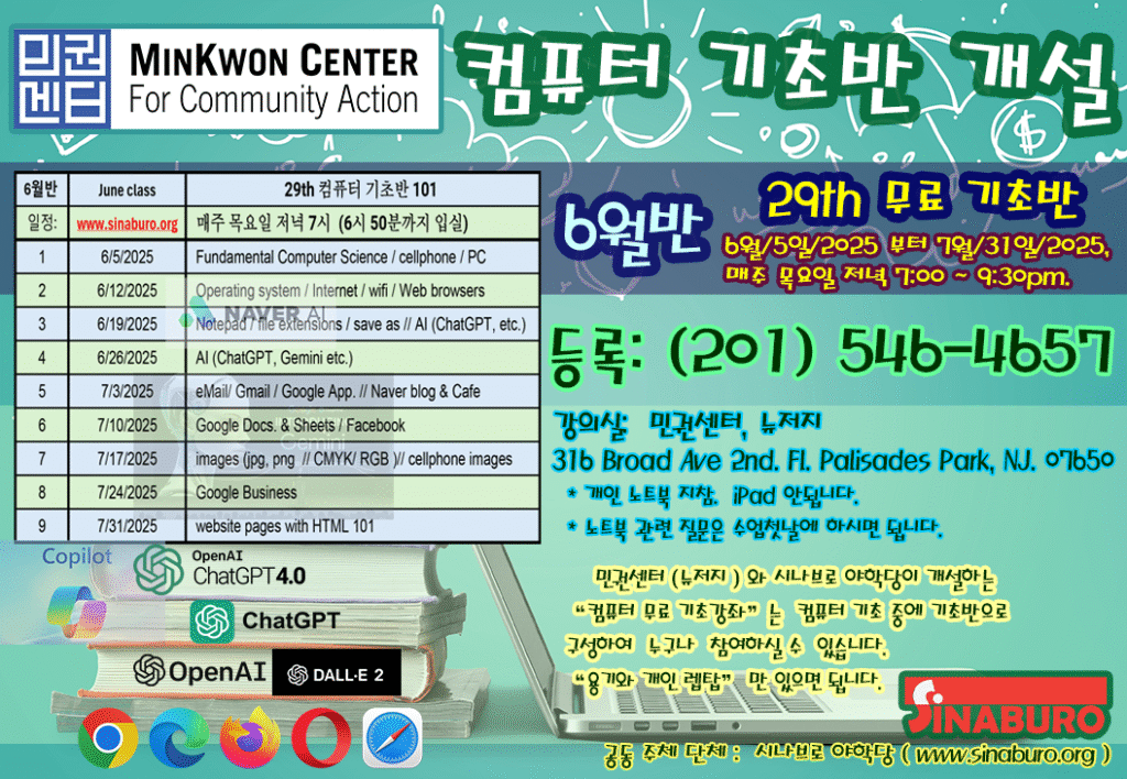 뉴저지 민권센터와 함께 무료 컴퓨터 기초반 교실을 6월 5일(목)부터 다시 시작합니다.