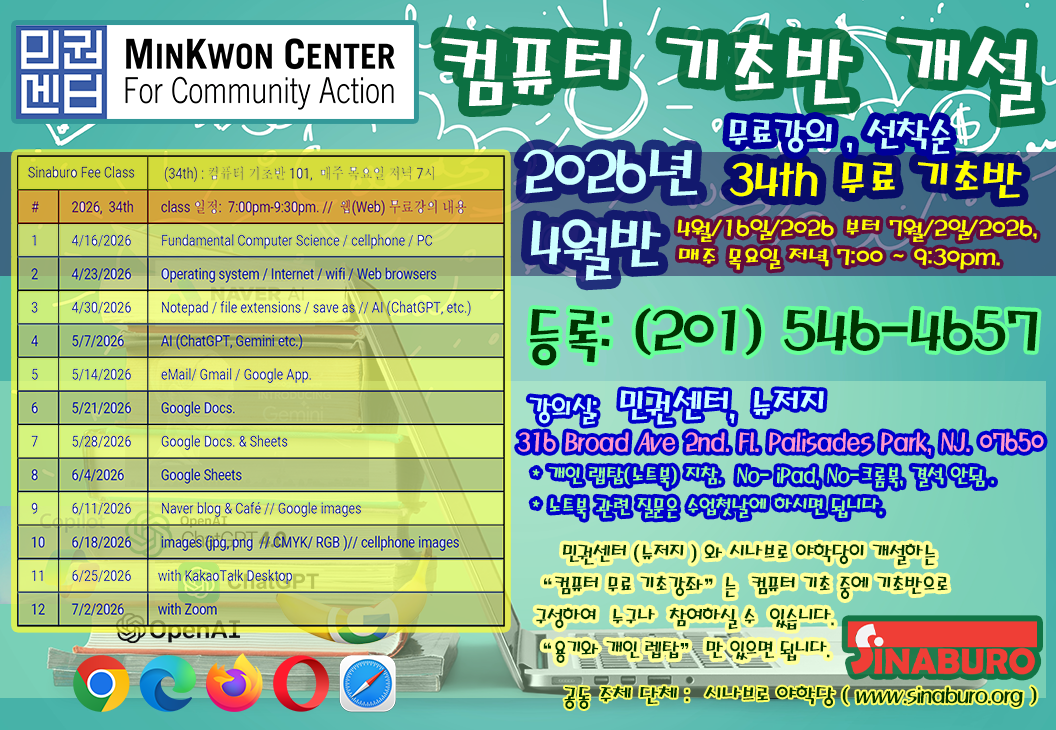 시나브로 야학당 그리고 뉴저지 민권센터와 함께 34th 무료 컴퓨터 기초반 교실을 4월 16일(목)부터 12주 과정을 새롭게 시작합니다.